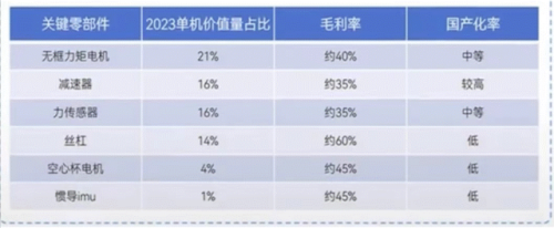 值得注意的是,丝杠是人形机器人中很重要的核心零部件,技术壁最高(毛利率高达60%,高于电机、减速器、力传感器等其他零部件),国产化率低,单机占比较大。