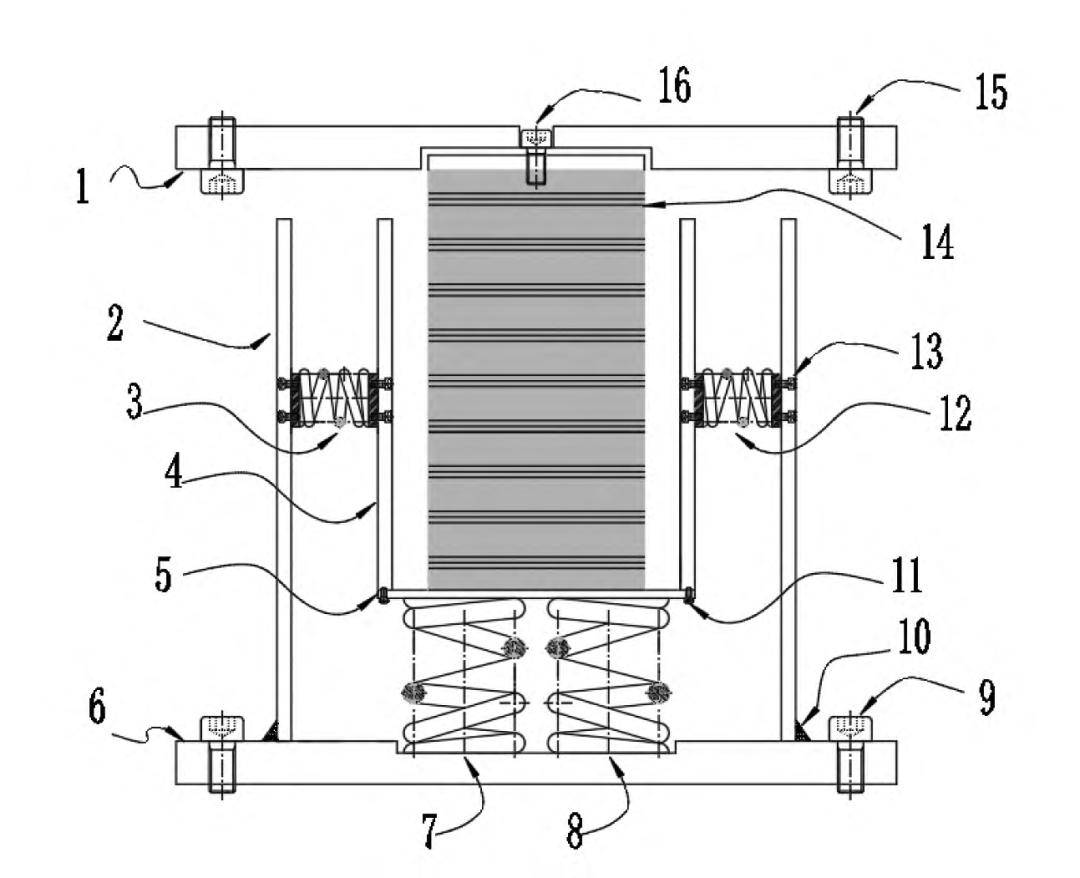 2—准零刚度螺旋弹簧外连接钢板;3—准零刚度 螺旋弹簧1;4—准零刚度螺旋弹簧内连接钢板;5—高阻尼厚肉橡胶垫底部连接板;6—支座整体下连接钢板;7-承载用螺旋弹簧1;8-承载用螺旋弹簧2; 9—支座整体上连接钢板连接螺栓;10—准零刚度螺旋弹簧外连接钢板焊接 点;11—高阻尼厚肉橡胶垫底部连接板连接螺栓;12—准零刚度螺旋弹簧2; 13—准零刚度螺旋弹簧连接螺栓;14—高阻尼厚肉橡胶垫;15—支座整体下连接钢板连接螺栓;16—支座整体上连接钢板连接螺栓。图2